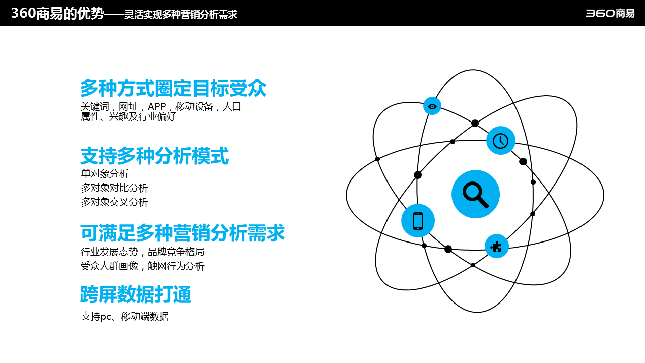 基于360大數據進行的數據挖掘分析,并匯聚多方數據源,為廣告主的投放和市場營銷提供決策支持, 讓數據在營銷推廣中發揮最大的價值。