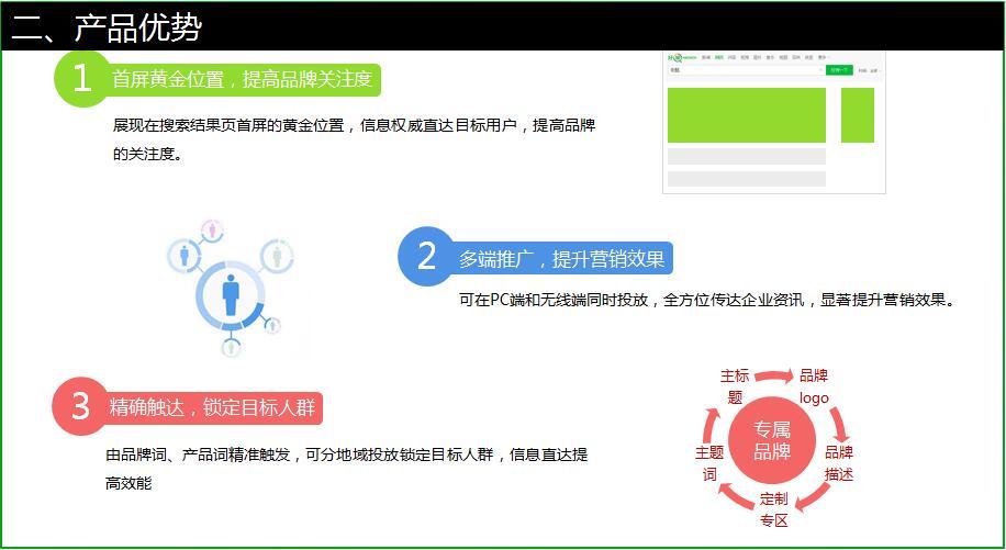 品牌直達是基于360搜索平臺的海量展現資源,在網民搜索結果頁的最上方為企業量身定制的精準品牌展示推廣形式。